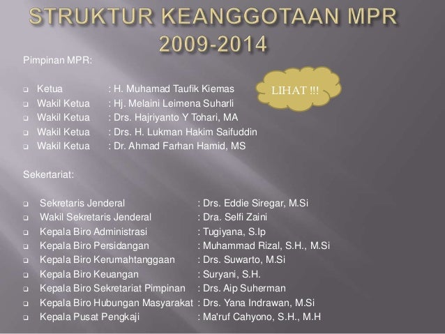 Ketua mahkamah agung dipilih dari dan oleh hakim agung dan diangkat oleh presiden. Anggota mpr yang dilantik terdiri dari 575 anggota. Masa jabatan anggota mpr adalah 5 tahun dan berakhir bersamaan pada saat anggota mpr yang baru mengucapkan sumpahjanji.