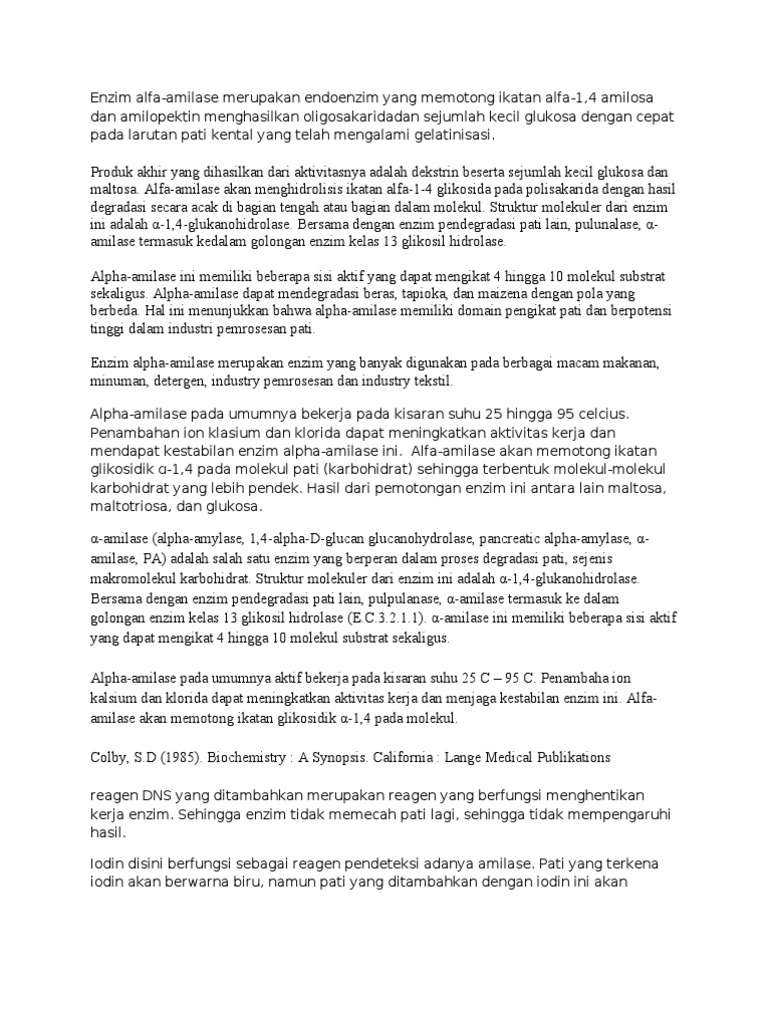 The user has requested enhancement of the downloaded file. Enzim a amilase merupakan salah satu jenis enzim yang banyak digunakan di industri terutama kemampuannya dalam menghidrolisis pati pada tahap likuifaksi. Ada di saluran pencernaan hewan.